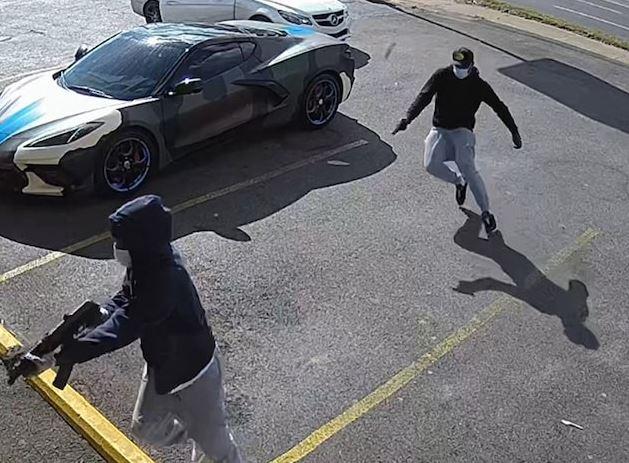 Las imágenes captadas por una cámara de vigilancia y publicadas por TMZ muestra a dos hombres, uno vestido con pantalón gris y suéter azul marino con capucha y cubrebocas cargando un AK-47; y al otro vestido con pantalón gris con suéter negro y gorra portando un arma corta.