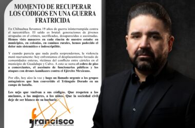 En Chihuahua llevamos 19 años de guerra ininterrumpida contra el narcotráfico. El saldo es brutal: generaciones de jóvenes atrapadas en el crimen, sacrificadas, asesinadas. Así lo declaró el diputado y coordinador de la Bancada Naranja de Movimiento Ciudadano, Francisco Sánchez Villegas, al presentar una carta abierta a los grupos del crimen organizado para que recuperen los códigos y cese el derramamiento de sangre inocente en Chihuahua.