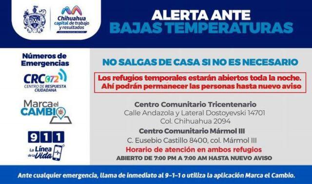 Los refugios estarán abiertos de 19:00 a 07:00 horas.