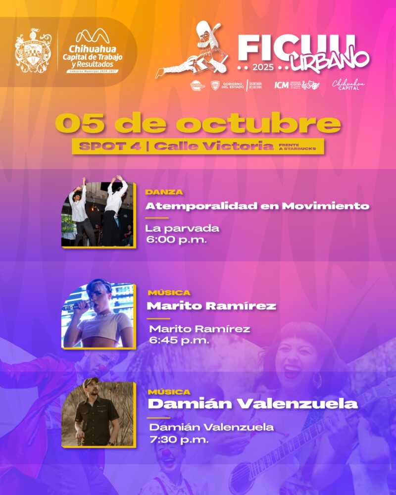 H. Ciudad de Chihuahua, Chih., a 4 de octubre de 2025.- El Gobierno Municipal, a través del Instituto de Cultura, informa que este día arranca oficialmente el Festival Internacional de la Ciudad de Chihuahua con la puesta en marcha del FICUU Urbano, un programa que busca dar visibilidad a los artistas locales a través de presentaciones en distintas disciplinas en el corazón de Chihuahua Capital.