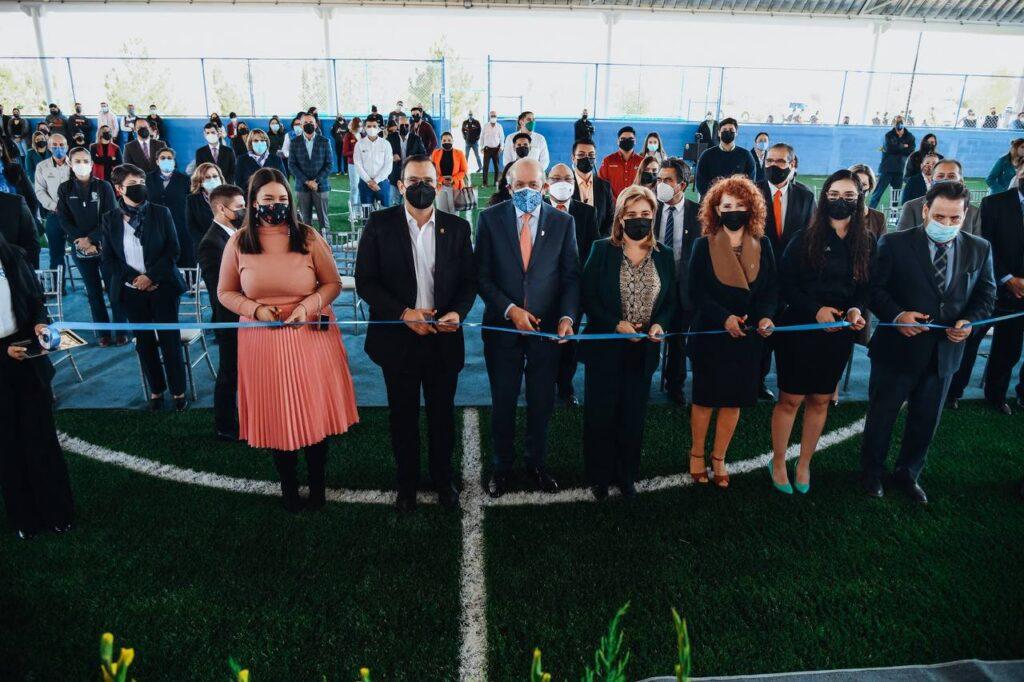 La gobernadora Maru Campos y el alcalde de Chihuahua, Marco Bonilla, inauguraron la rehabilitación de una cancha de futbol rápido dentro de las instalaciones del Instituto Tecnológico de Chihuahua (ITCH), la obra fue uno de los proyectos ganadores del Presupuesto Participativo 2021, donde se incluyó la instalación de luminarias, techumbre y pasto sintético.