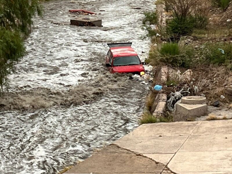 Una vehículo pick up de color rojo fue arrastrada parcialmente por la corriente al interior del cauce tras una creciente repentina. El conductor, un hombre de 55 años, ya se encontraba fuera del vehículo al momento de la atención. No se reportaron personas lesionadas.