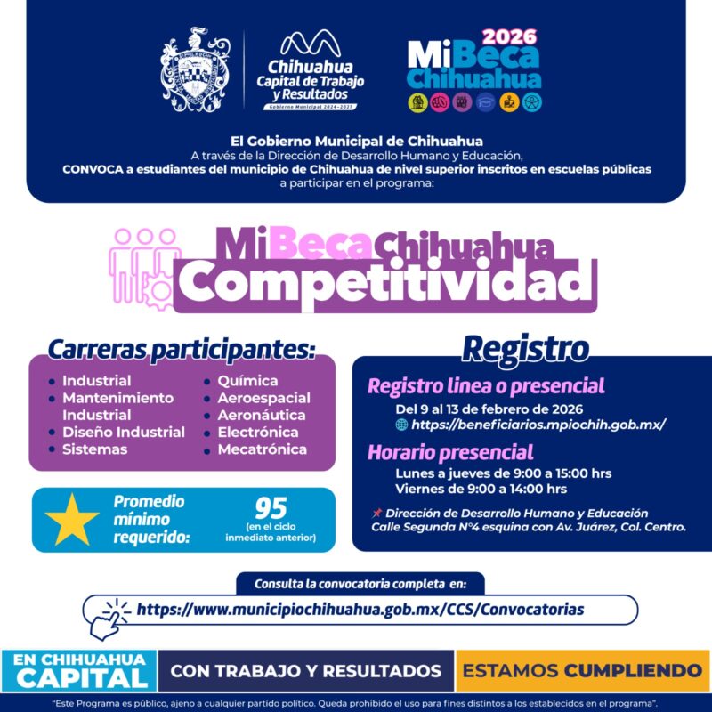 H. Ciudad de Chihuahua, Chih., a 9 de febrero de 2026.- El Gobierno Municipal de Chihuahua, a través de la Dirección de Desarrollo Humano y Educación, informa que, del 9 al 13 de febrero de 2026, estará abierto el registro para que estudiantes del municipio inscritos en instituciones públicas de nivel superior puedan participar en el programa “Beca de Competitividad”.