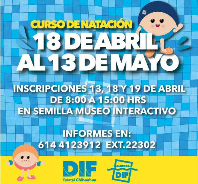 La Dirección de Esparcimiento del DIF Estatal invita a jóvenes, adultos y adultos mayores a inscribirse a los cursos de natación y aquaerobics que ofrece en las instalaciones de su alberca pública, que serán impartidos del 18 de abril y al 13 de mayo.