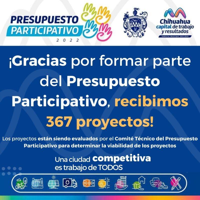 En el marco de los primeros 100 días de trabajo y resultados, el Gobierno Municipal, a través de la Dirección de Planeación y Evaluación y de la Dirección de Desarrollo Humano y Educación, concluyó el plazo de recepción de proyectos ciudadanos para el Presupuesto Participativo 2022, con un total de 367 proyectos recibidos.