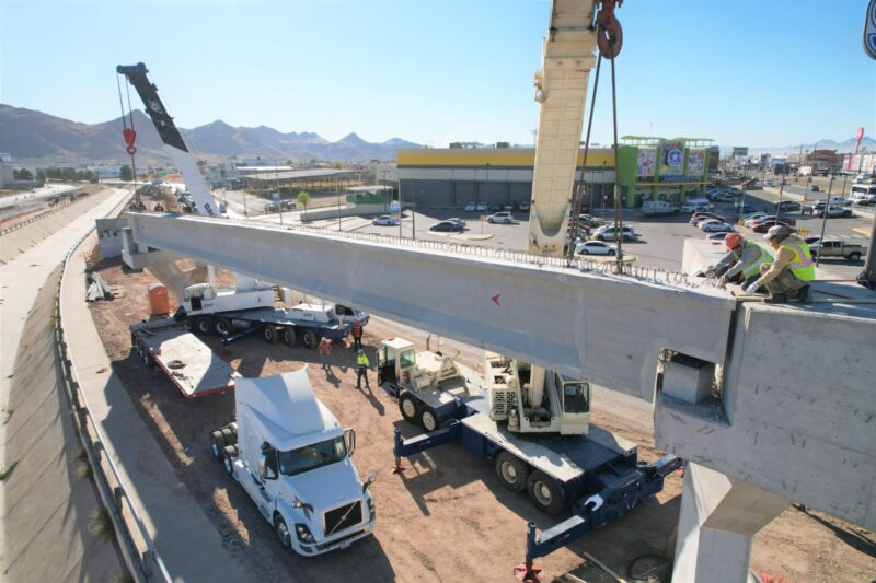 H. Ciudad de Chihuahua, Chih., a 4 de marzo de 2026.- Con acciones que consolidan el avance en la movilidad, el Gobierno Municipal, a través de la Dirección de Obras Públicas, continúa con el desarrollo de la superestructura del Paso Superior ubicado en la vialidad Los Nogales y avenida de las Industrias, mediante la instalación de trabes en el cuerpo sur.