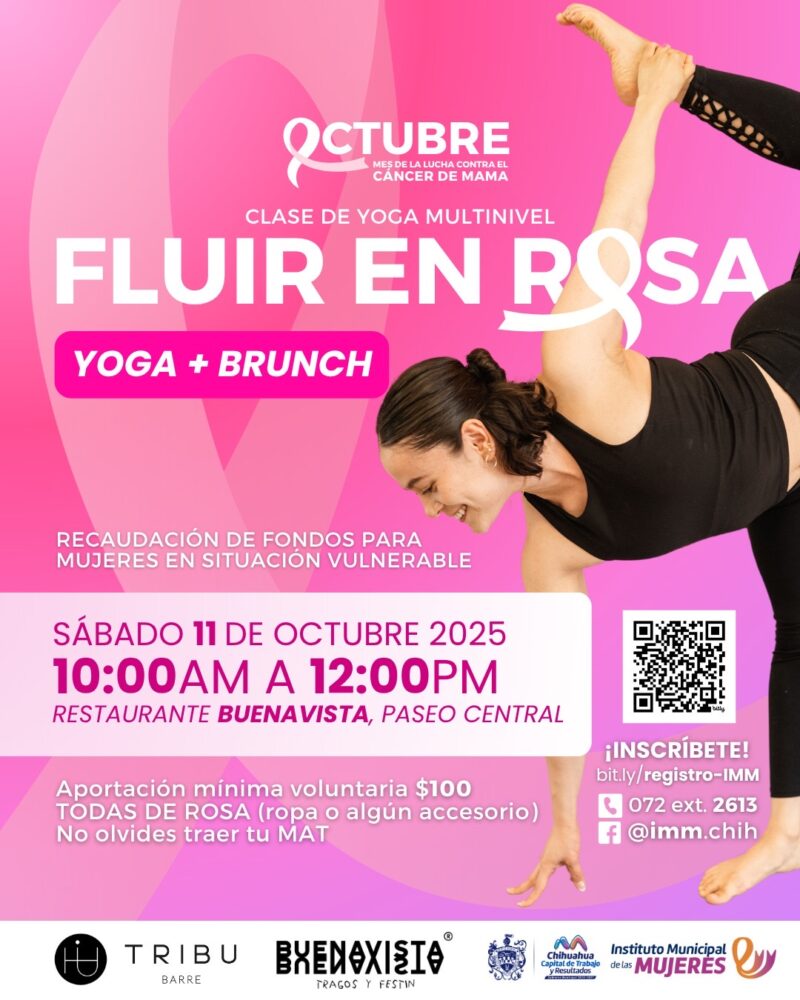 H. Ciudad de Chihuahua, Chih., a 9 de octubre de 2025.– El Gobierno Municipal de Chihuahua, a través del Instituto Municipal de las Mujeres (IMM), invita a participar en la clase de yoga multivel “Fluir en Rosa”, a cargo de «TRUBU Barre» que se realizará este sábado 11 de octubre de 10:00 a.m. a 12:00 p.m. en el restaurante Buenavista de Paseo Central, que tendrá una cuota de recuperación a partir de 100 pesos.
