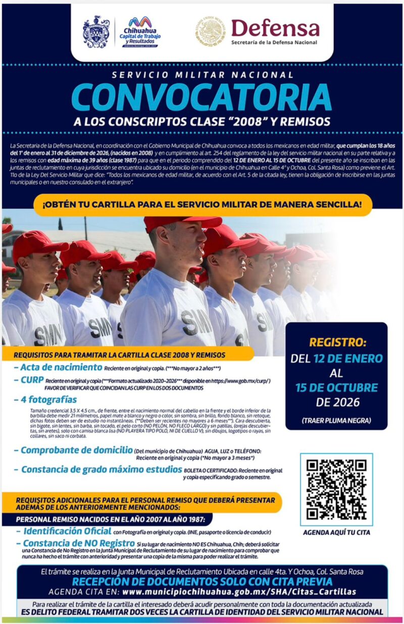 H. Ciudad de Chihuahua, Chih., a 25 de febrero de 2026.- El Gobierno Municipal de Chihuahua invita a las y los jóvenes de la capital a realizar el trámite de su Cartilla del Servicio Militar Nacional, documento que representa un paso importante en su formación cívica y compromiso con el país.