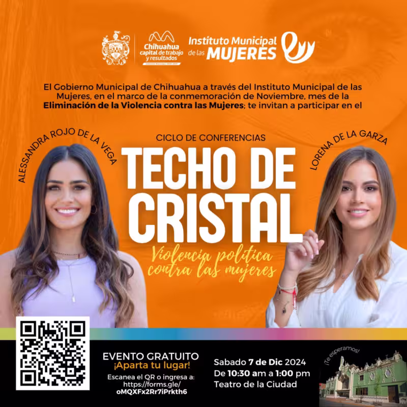 Chihuahua, Chih., a 29 de noviembre de 2024.- En el marco del Día Internacional de la Eliminación de la Violencia contra las Mujer, el Gobierno Municipal, a través del Instituto Municipal de las Mujeres, invita a la conferencia “Techo de Cristal”, este sábado 7 de diciembre a las 10:30 am en el Teatro de la Ciudad.