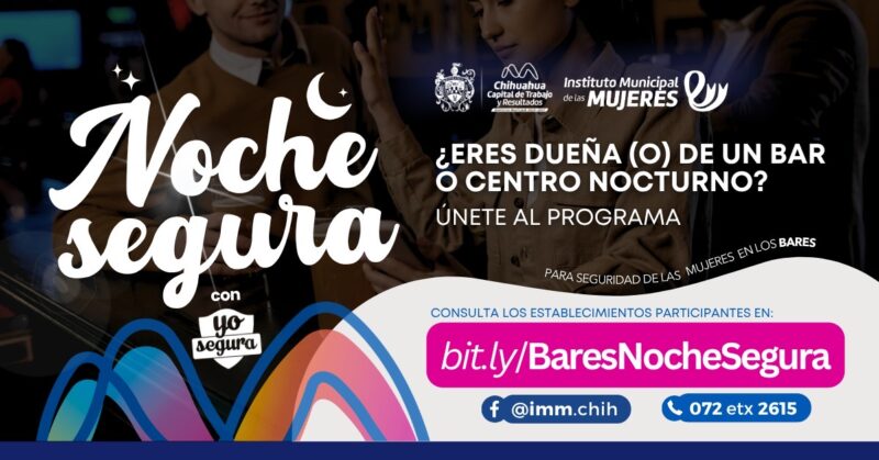H. Ciudad de Chihuahua, Chih., 17 de julio de 2025.- El Gobierno Municipal de Chihuahua, a través del Instituto Municipal de las Mujeres (IMM), invita a bares, restaurantes y centros nocturnos a formar parte del programa “Noche Segura”, una estrategia que promueve espacios libres de violencia y protocolos de actuación para proteger a mujeres en situaciones de acoso o peligro.