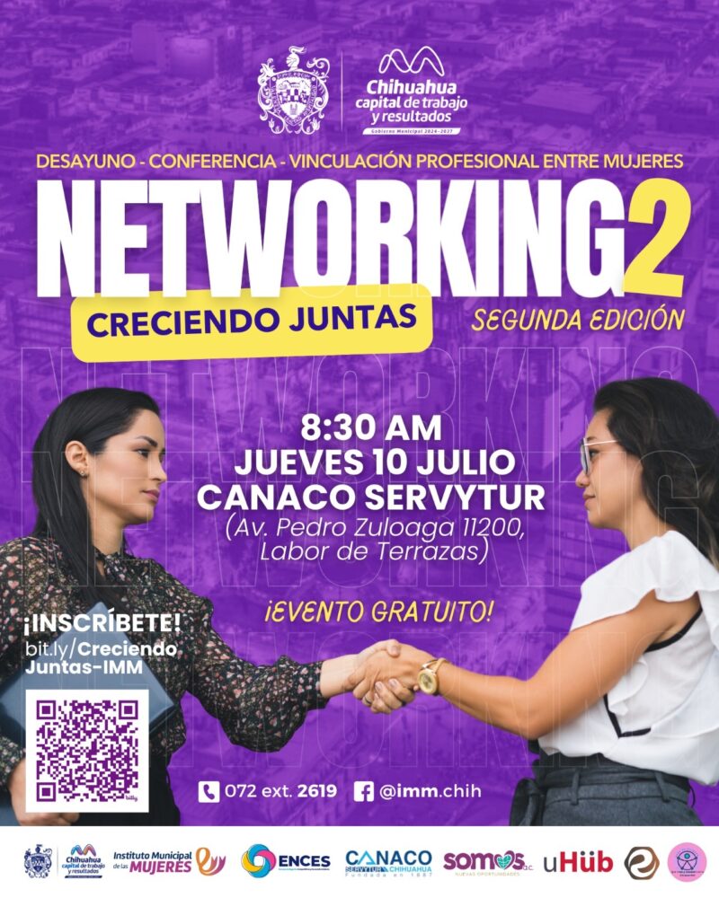 H. Ciudad de Chihuahua, Chih., a 9 de junio de 2025.- El Gobierno Municipal, mediante el Instituto Municipal de las Mujeres y la Dirección de Desarrollo Económico y Competitividad, invita al networking para mujeres empresarias y emprendedoras “Creciendo Juntas” en su segunda edición.
