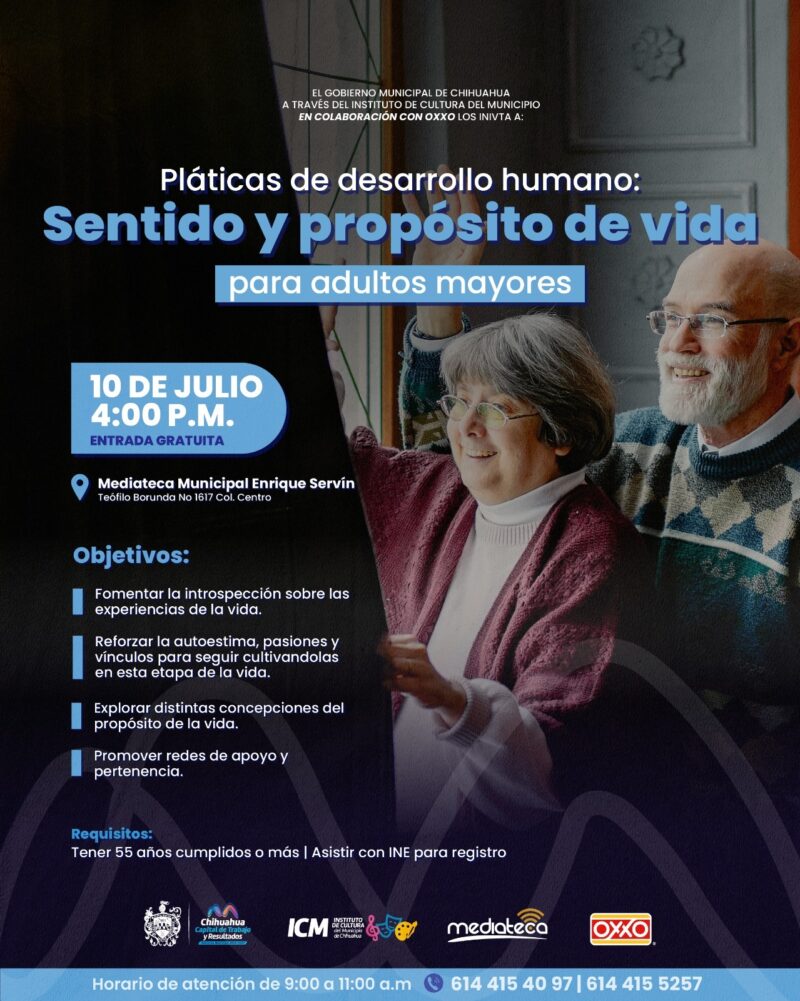 H. Ciudad de Chihuahua, Chih., a 8 de julio de 2025.- El Gobierno Municipal, través del Instituto de Cultura del Municipio y en colaboración con OXXO, invita a personas adultas mayores a participar en la plática de desarrollo humano “Sentido y propósito de vida”, este jueves 10 de julio a las 4:00 pm en la Mediateca Municipal “Enrique Servín”, ubicada en Teófilo Borunda número 1617, colonia Centro.