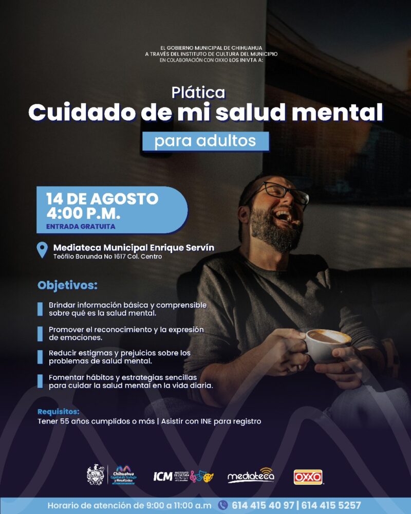 H. Ciudad de Chihuahua, Chih., a 5 de agosto de 2025.- El Gobierno Municipal de Chihuahua, a través del Instituto de Cultura del Municipio y en colaboración con OXXO, invita a las y los adultos mayores a participar en la plática “Cuidado de mi salud mental”, este jueves 14 de agosto a las 4:00 pm en la Mediateca Municipal Enrique Servín Herrera “Guardian de las Palabras”, ubicada en Teófilo Borunda número 1617, colonia Centro.