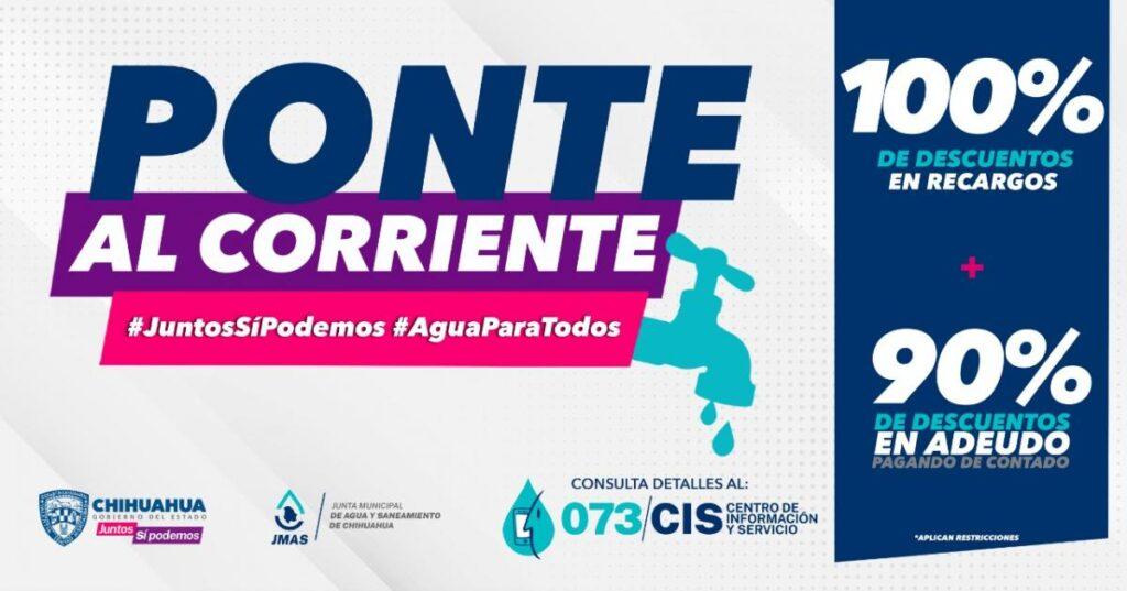 La Junta Municipal de Agua y Saneamiento (JMAS) Chihuahua, invita a la población a aprovechar la última semana de descuentos para las cuentas de uso doméstico que tienen recargos y adeudos en el servicio de agua potable y drenaje, como parte de su programa “Ponte al Corriente”.