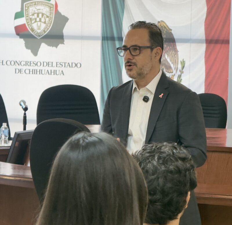 Chihuahua, Chih.- En un encuentro con alumnos de la Facultad de Derecho de la Universidad Autónoma de Chihuahua, el diputado por el Partido Acción Nacional (PAN), Jorge Soto, destacó la importancia de la preparación y la participación informada de los jóvenes en los asuntos públicos, durante su visita al Congreso del Estado.