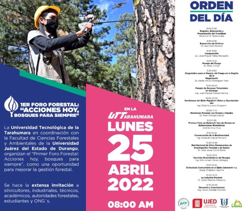 El Foro se llevará a cabo el día 25 de abril del presente año, en las instalaciones de la Universidad Tecnológica de la Tarahumara a partir de las 8 horas, y estará a silvicultores, industriales, técnicos, académicos, autoridades forestales, estudiantes y organizaciones no gubernamentales.