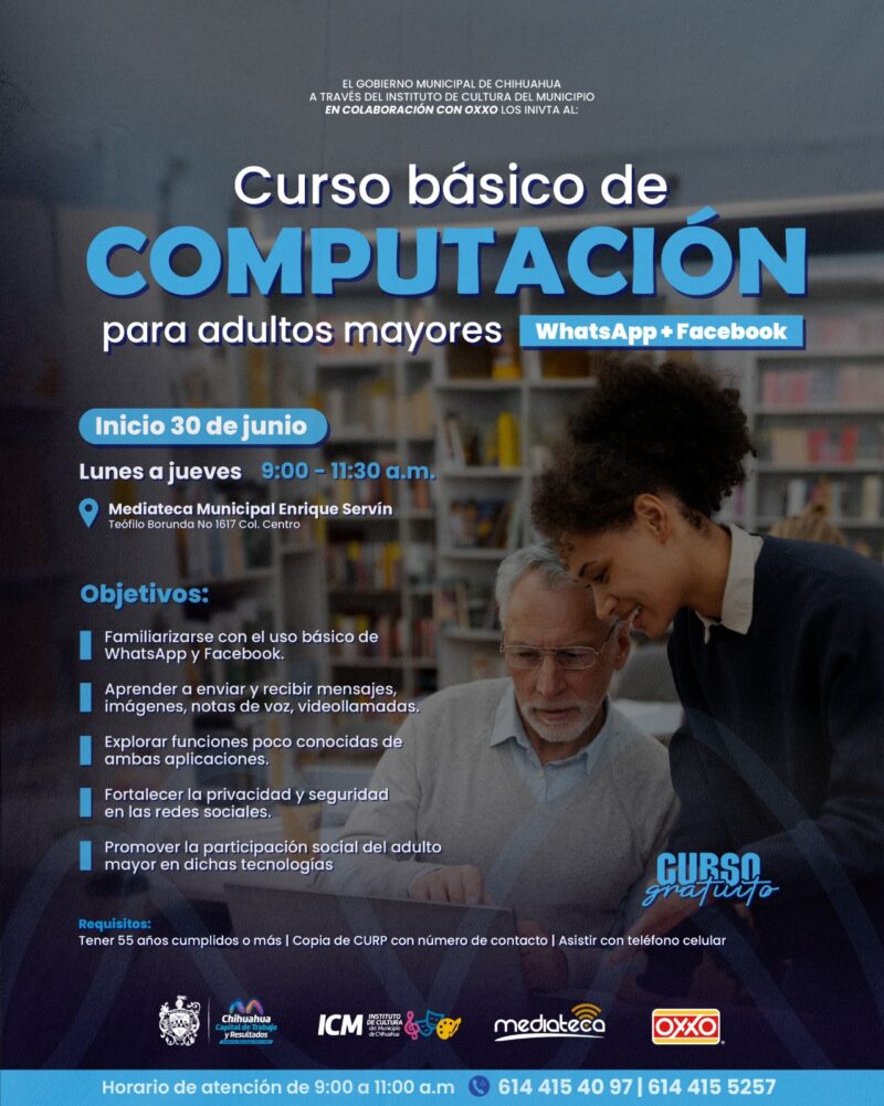 H. Ciudad de Chihuahua, Chih. A 23 de junio de 2025.– El Gobierno Municipal de Chihuahua, a través del Instituto de Cultura del Municipio, invita a las personas adultas mayores a inscribirse en el Curso Básico de Computación, que dará inicio el próximo 30 de junio en la Mediateca Municipal Enrique Servín.