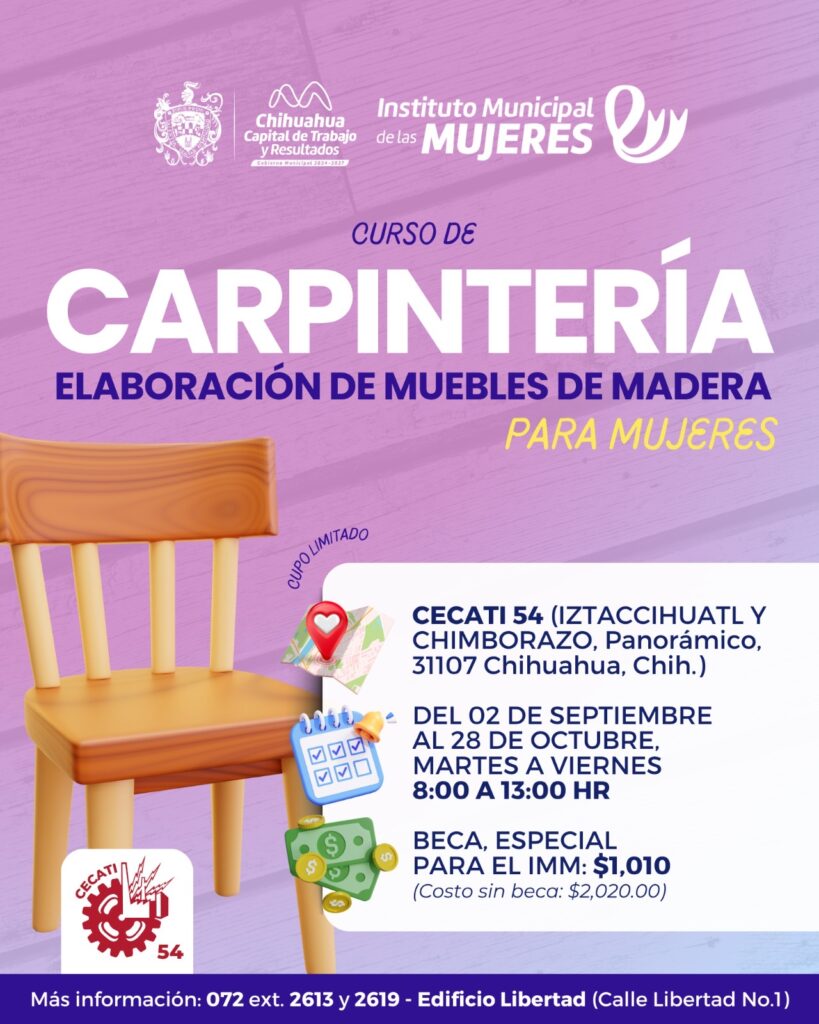 - Curso de Carpintería: elaboración de muebles de madera se llevará a cabo del 2 de septiembre al 28 de octubre, de martes a viernes de 8:00 a 13:00 horas.