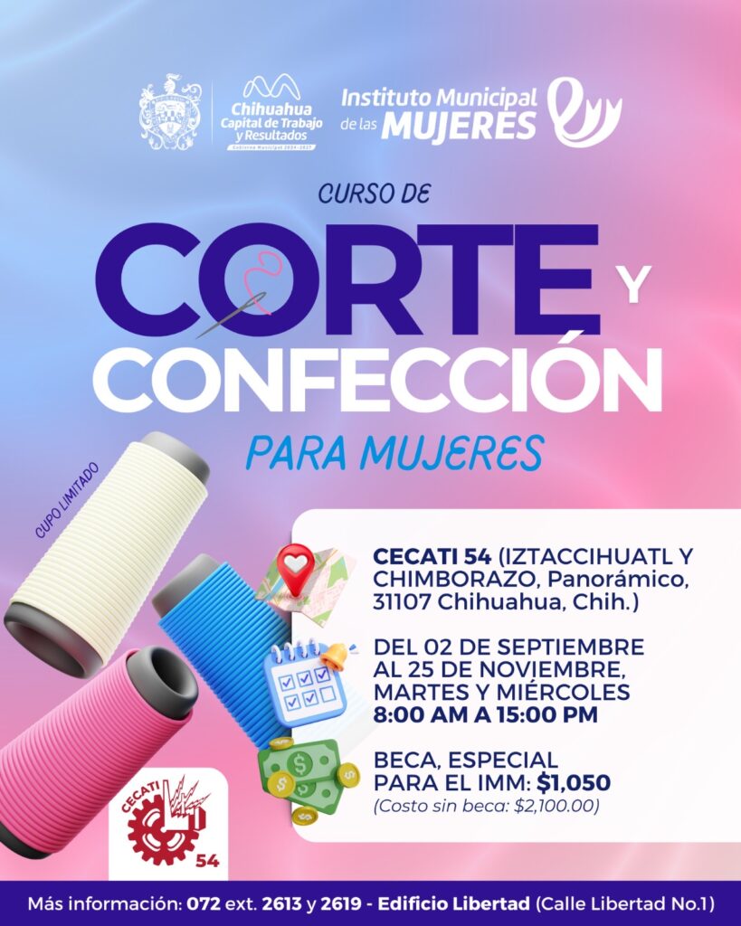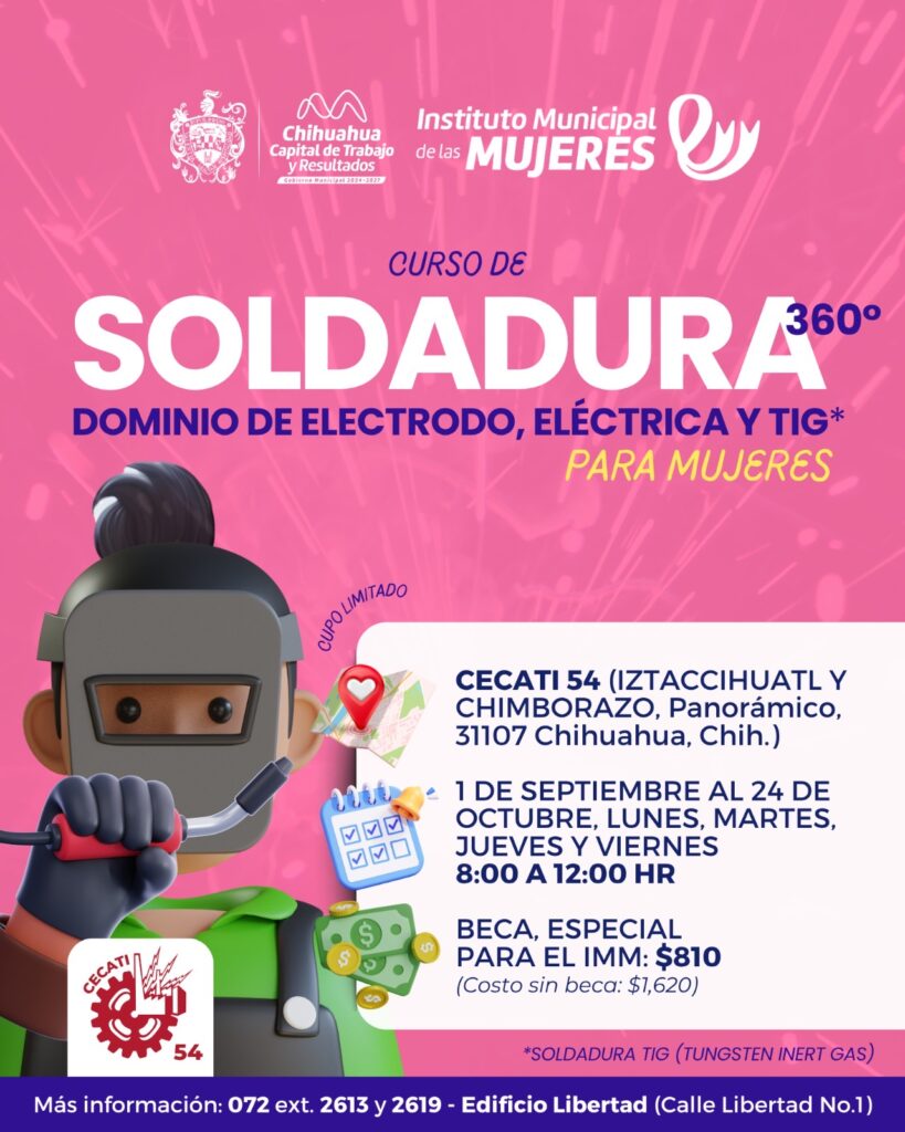 H. Ciudad de Chihuahua, Chih., a 04 de agosto de 2025.- El Instituto Municipal de las Mujeres (IMM) del Gobierno Municipal, invita a mujeres de la ciudad a participar en los nuevos cursos de soldadura, carpintería, informática y corte y confección, donde podrán aprender herramientas útiles, formación técnica y empoderamiento económico para más oportunidades laborales.