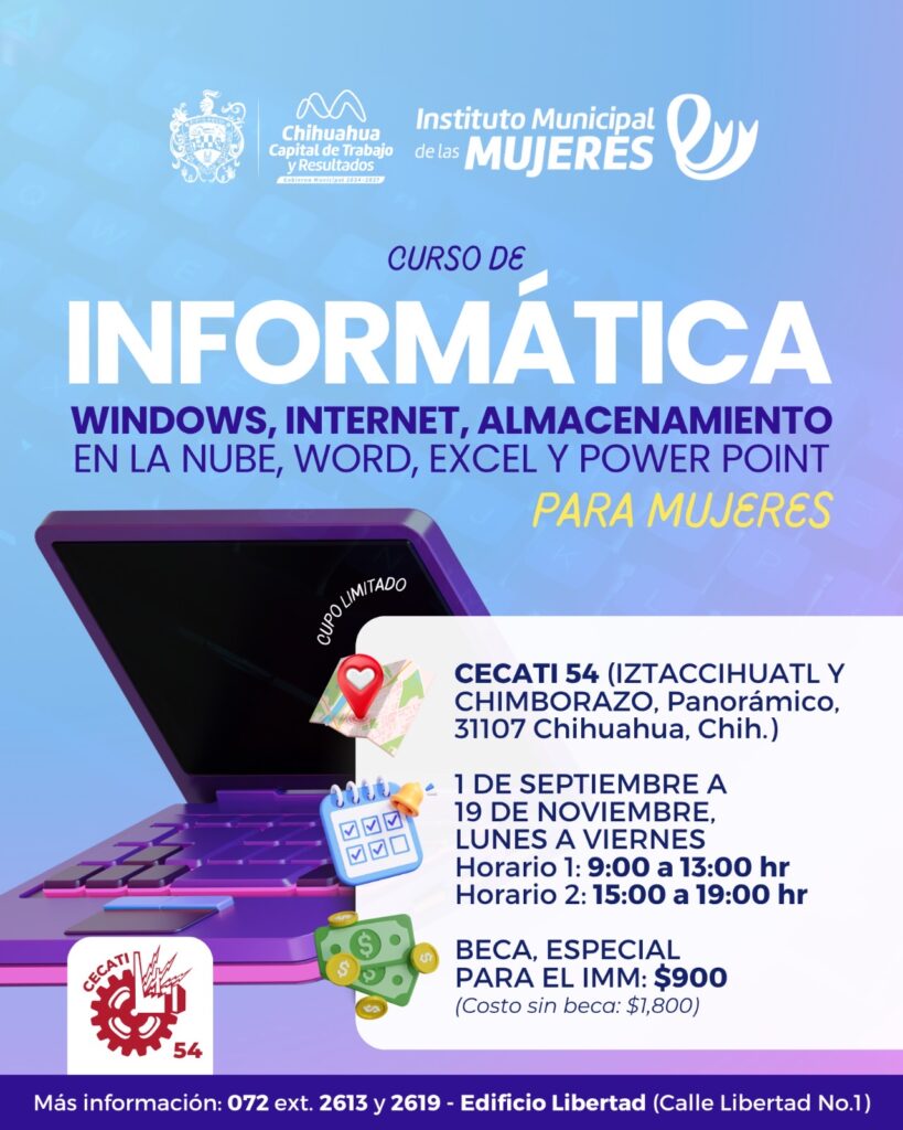 - Curso de Informática: Windows, internet, almacenamiento en la nube, Word, Excel y PowerPoint, se desarrollará del 1 de septiembre al 19 de noviembre de lunes a viernes, con dos horarios disponibles: 9:00 a 13:00 horas o 15:00 a 19:00 horas.
