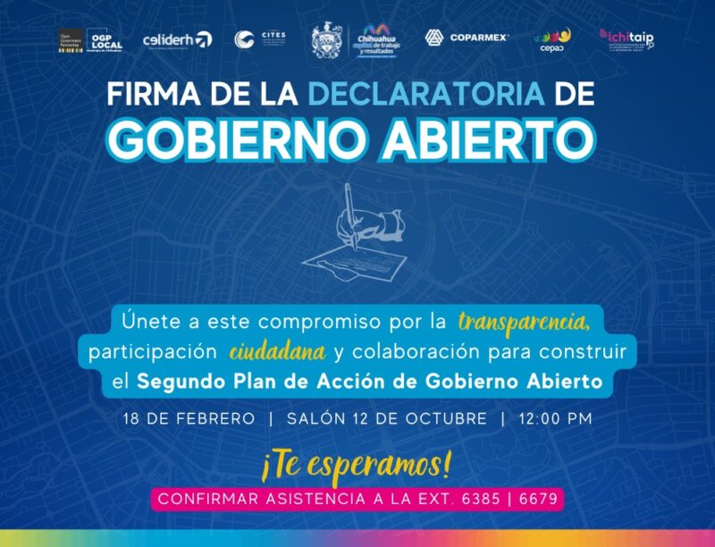 Chihuahua, Chih., a 13 de febrero de 2025.- El Gobierno Municipal, invita a la firma de declaratoria de Gobierno Abierto, el próximo martes 18 de febrero, en las instalaciones del salón 12 de octubre a las 12:00 pm, donde se reafirmará el compromiso con la transparencia y rendición cuentas.