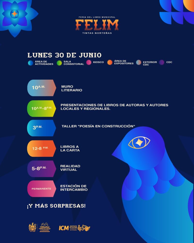 H. Ciudad de Chihuahua, Chih. A 13 de junio del 2025.– El Gobierno Municipal de Chihuahua, a través del Instituto de Cultura del Municipio, invita a disfrutar de la primera edición de la Feria del Libro Municipal FELIM: Tintas Norteñas, que se llevará a cabo del 28 al 30 de junio con entrada libre.