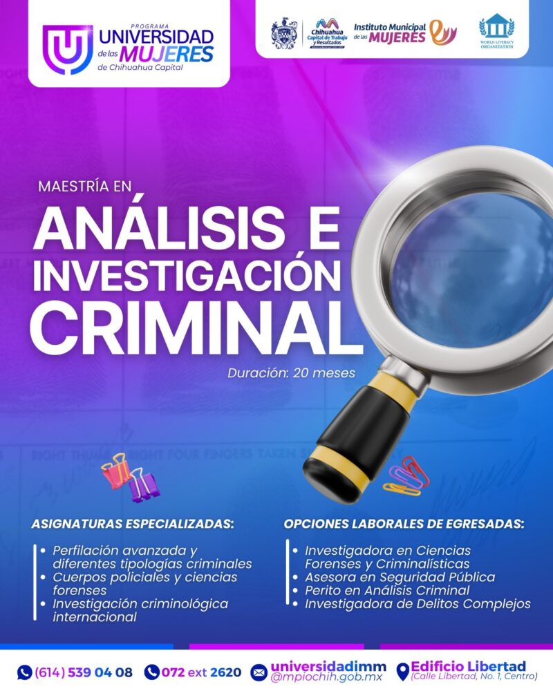 H. Ciudad de Chihuahua, Chih., a 25 de Febrero 2026.- El Gobierno Municipal de Chihuahua, a través del Instituto Municipal de las Mujeres (IMM) y la Organización Mundial de Alfabetización (WLO), invitan a las mujeres del estado a profesionalizarse con la Maestría en Análisis e Investigación Criminal, que forma parte de la oferta académica del programa de Universidad de las Mujeres, con becas que permiten ampliar el acceso a estudios de posgrado de alta especialización.