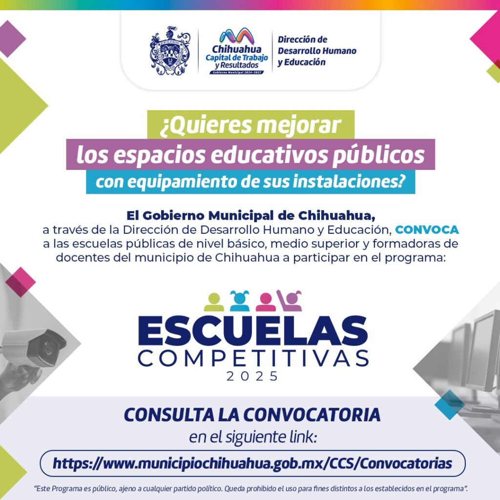 H. Ciudad de Chihuahua, Chih., a 28 de septiembre de 2025.- El Gobierno Municipal, a través de la Dirección de Desarrollo Humano y Educación, invita a instituciones educativas públicas de nivel básico, medio superior y formadoras de docentes de la ciudad a participar en el Programa Escuelas Competitivas 2025, para contribuir a mejorar las condiciones de aprendizaje mediante el equipamiento de las escuelas.