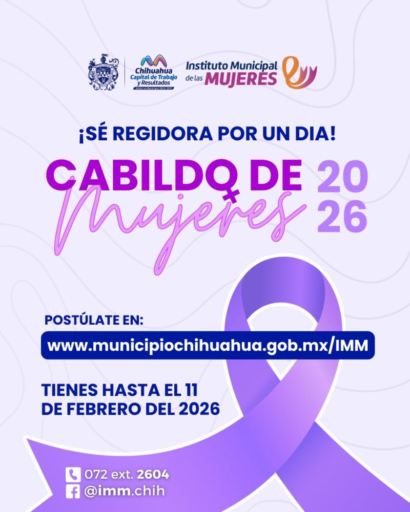 H. Ciudad de Chihuahua, Chih., a 23 de enero de 2026.- Con el objetivo de fortalecer la participación política de las mujeres y promover su liderazgo en la toma de decisiones públicas, el Gobierno Municipal de Chihuahua, a través del Instituto Municipal de las Mujeres (IMM), invita a las chihuahuenses a participar en la convocatoria “Regidora por un Día”, en el marco del Cabildo de Mujeres 2026.