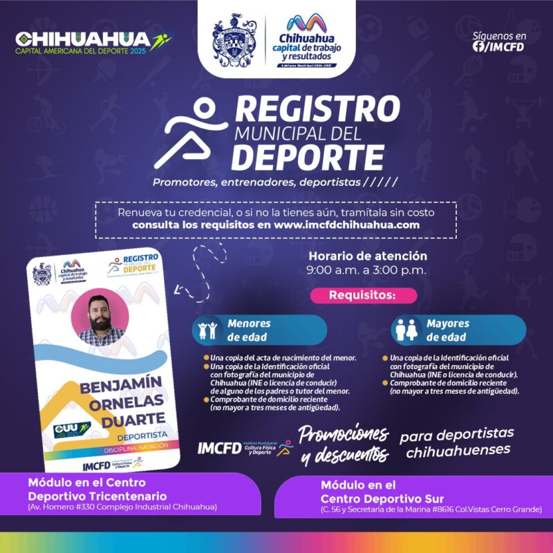 Para mayores informes pueden consultar la página web del Instituto Municipal de Cultura Física y Deporte https://www.imcfdchihuahua.com/registromunicipaldeldeporte o la página de Facebook www.facebook.com/imcfd.