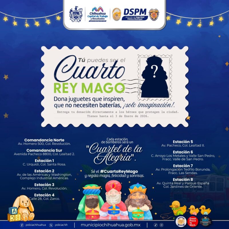 H. Ciudad de Chihuahua, Chih., a 1 de diciembre del 2025.- Elementos del H. Cuerpo de Bomberos y Rescate, dieron a conocer que a partir de hoy 1 de diciembre inició la colecta anual de juguetes bajo el lema, “El Cuarto Rey Mago”, donde invitan a la ciudadanía a participar con la donación de juguetes que se entregarán a niñas y niños de zonas vulnerables.