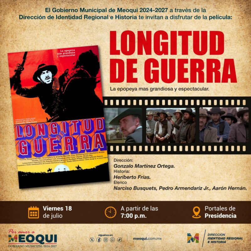 “Vamos a presentar la película Longitud de Guerra, que narra los antecedentes de la Revolución Mexicana. Consideramos que la cuna de las revoluciones fue aquí en Chihuahua, en lugares como Coyame, y queremos darles el lugar histórico que merecen”, así lo dio a conocer el profesor Francisco González, director de Promoción de Identidad e Historia, además, explicó que este programa busca acercar a los diversos sectores de la comunidad a hechos relevantes de la historia de México, mediante la proyección de películas clave, muchas de ellas filmadas o ambientadas en el estado de Chihuahua.