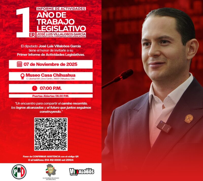 Chihuahua.– Con el firme compromiso de rendir cuentas a la ciudadanía, el diputado del Partido Revolucionario Institucional (PRI) por Chihuahua, José Luis Villalobos García, presentará su Primer Informe de Actividades Legislativas el viernes 7 de noviembre de 2025, a las 19:00 horas, en Casa Chihuahua. Las puertas estarán abiertas al público desde las 18:30 horas.
