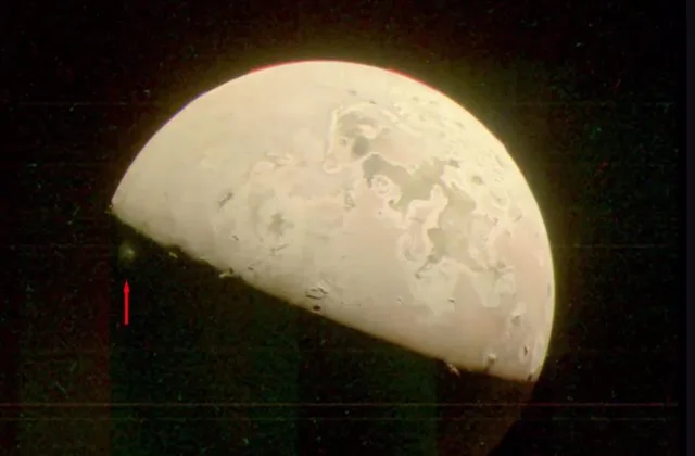 A una distancia de 12 mil kilómetros durante el sobrevuelo del 15 de octubre, el más cercano registrado hasta la fecha, el Jet Propulsion Laboratory (JPL), encargado de operar la misión, publicó una imagen reveladora. En la instantánea, señalada por una flecha roja, apenas se distingue la columna en la oscuridad bajo el terminador, la línea que separa el día y la noche en Júpiter.