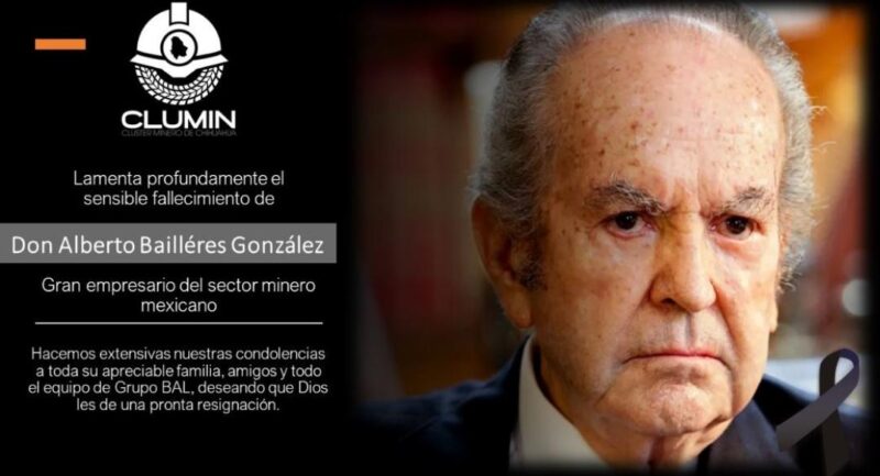 El Clúster Minero de Chihuahua (CLÚMIN), lamenta el sensible fallecimiento de Don Alberto Bailléres, gran empresario del sector minero mexicano y fundador del Grupo Bal, el cual cuenta con dos empresas que se dedican a la extracción de minerales en el estado y que, han generado más de 2500 empleos directos y por lo menos unos 12,500 indirectos.