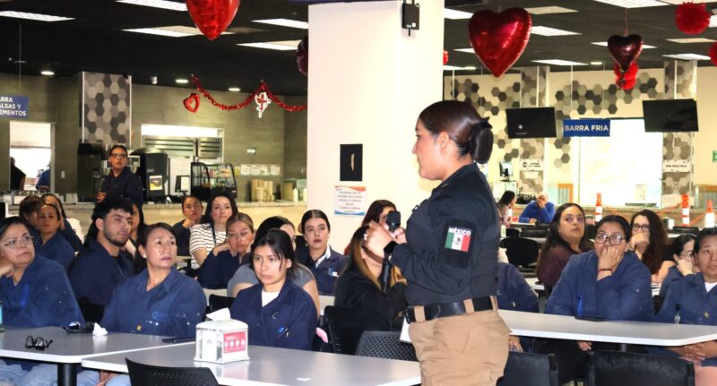 H. Ciudad de Chihuahua, Chih., 13 de marzo de 2026.- Como parte de las acciones del programa Siempre Acompañadas de la Dirección de Seguridad Pública Municipal (DSPM), imparte platicas de seguridad para las mujeres que laboran en la industria maquiladora para que tengan las herramientas para prevenir una situación de violencia.