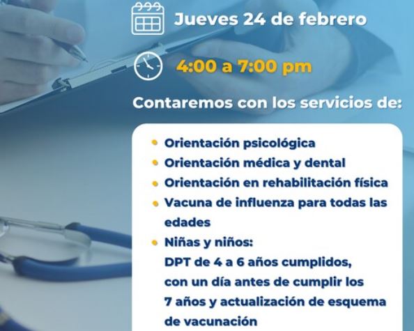 Este jueves 24 de febrero, a partir de las 4:00 pm y hasta las 7:00 pm, se llevará a cabo la jornada “Salud cerca de ti”, en el corredor de Vistas Cerro Grande, durante la cual se estarán brindando los servicios de prevención, atención y orientación médica, psicológica y de rehabilitación física, así como también se contará con banco de medicamentos; todo esto con el propósito de brindar servicios de salud que abonan al bienestar de la población.