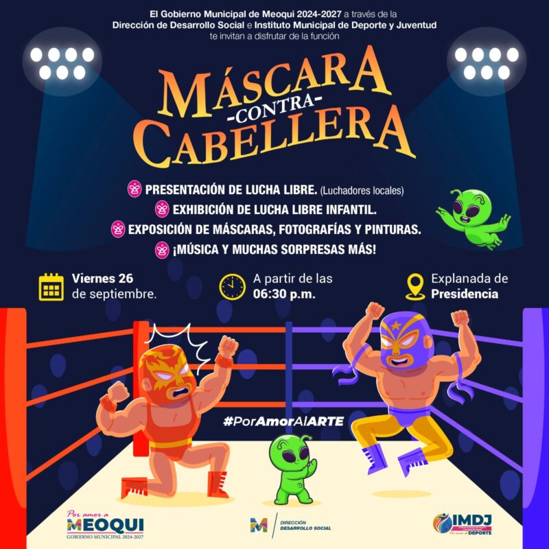 Este viernes 26 de septiembre a partir de las 6:30 de la tarde, la explanada de la Presidencia Municipal de Meoqui será el escenario de la función de lucha libre “Máscara contra Cabellera”, evento que forma parte del programa cultural Por Amor al Arte, con presentaciones de luchadores locales, una exhibición de lucha libre infantil, así como exposición de máscaras, fotografías y pinturas, además de música y otras sorpresas para el público.