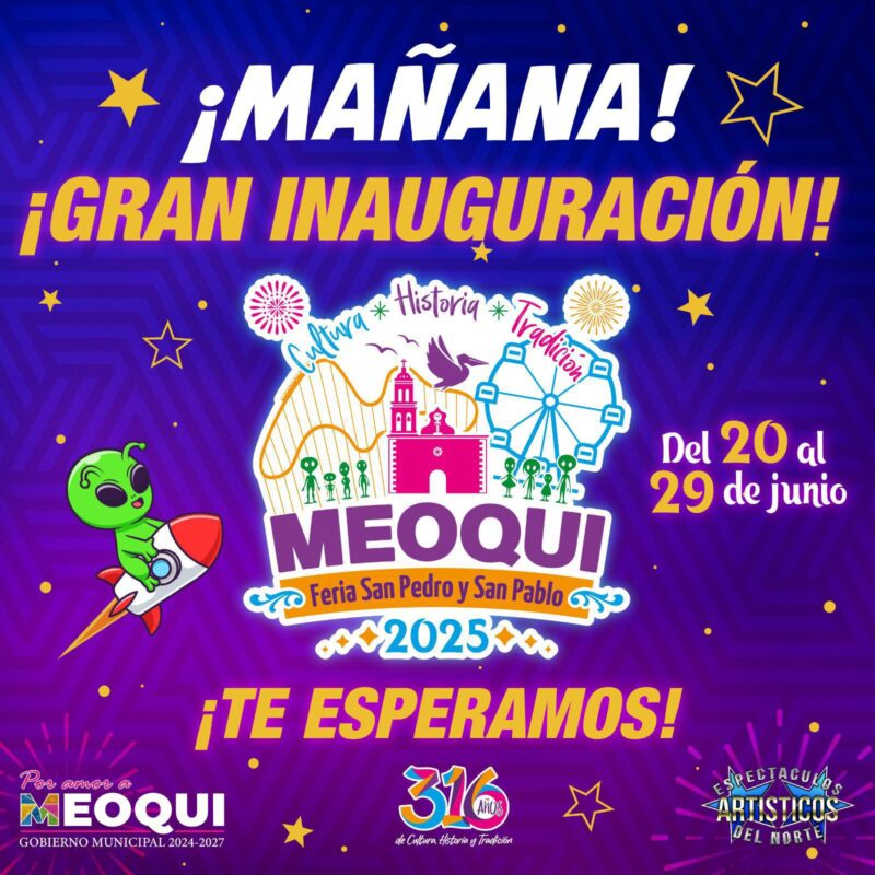 Falta solo un día para que Meoqui se ponga de fiesta con la Feria San Pedro y San Pablo 2025 del 20 al 29 de junio, la cual tendrá como estelares a artistas de talla internacional como Luis Alfonso “El Yaki” y Tropicalisimo Apache, en donde los habitantes de todo el estado podrán pasar un momento inolvidable con sus familias.