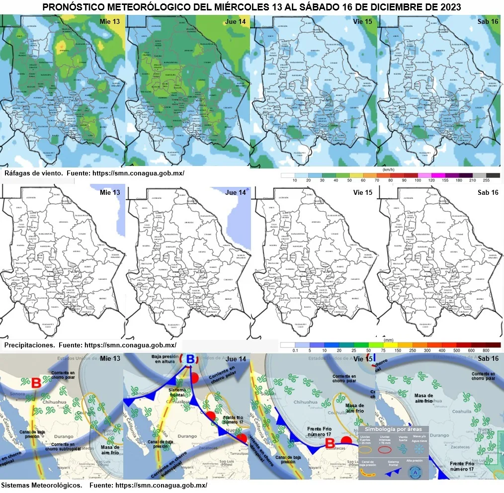 El pronóstico para el viernes 15 de diciembre es (máx/min °C): Chihuahua 16/4, Juárez 15/2, Janos 14/-3, Madera 15/-5, Temósachic 17/-7, Cuauhtémoc 14/0, Ojinaga 18/7, Delicias 18/5, Camargo 17/5, Jiménez 15/4, Parral 21/8, Creel 15/-5, Chínipas 30/10, Guachochi 15/-5 y El Vergel 14/-7.