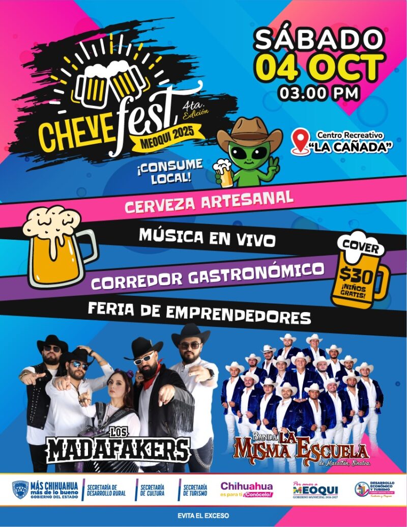 Este sábado 4 de octubre se llevará a cabo la 4ta edición del CheveFest Meoqui 2025, un evento 100% familiar que contará con Corredor Gastronómico, Feria de Emprendedores, Cluster Cervecero, cuadros culturales y la presentación de Los Madafakers y Banda La Misma Escuela, todo esto en el Centro Recreativo La Cañada, lugar donde ya se tiene todo listo para recibir a las familias de Meoqui y todo el estado a partir de las 3 de la tarde.