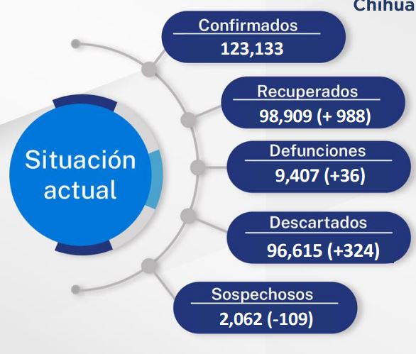 la Secretaría de Salud de Chihuahua, presenta este 4 de febrero el reporte COVID-19, en el cual se registran 123 mil 133 (+1,238) casos confirmados en la entidad, 98 mil 909 (+988) recuperados, 96 mil 615 (+324) descartados y 2 mil 062 (-109) sospechosos.