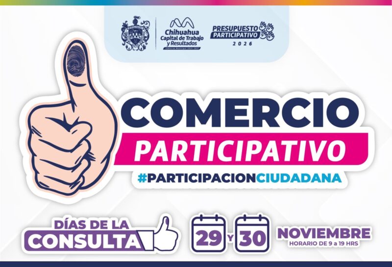 H. Ciudad de Chihuahua, Chih., a 18 de noviembre de 2025.- El Gobierno Municipal, a través de la Coordinación de Participación Ciudadana, invita a negocios y comercios locales a integrarse al programa Comercios Participativos, con el propósito de impulsar la participación ciudadana durante la jornada de votación del Presupuesto Participativo 2026, que se llevará a cabo los días 29 y 30 de noviembre.