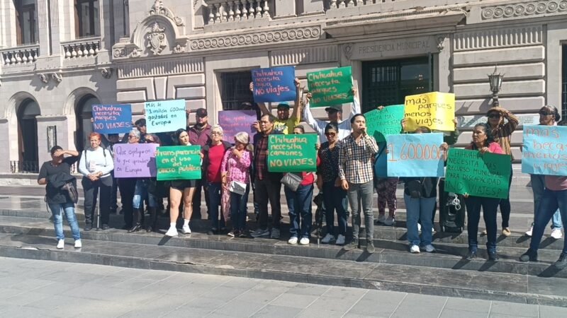 Ciudadanos se colocaron enfrente del Ayuntamiento de Chihuahua en el centro de la ciudad tras indicar que no los dejaron pasar a ver el octavo informe de la sindica Olivia Franco Barragán.