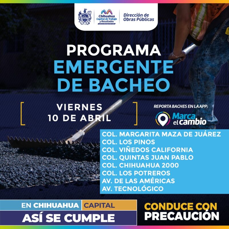 H. Ciudad de Chihuahua, Chih., a 10 de abril de 2026.- El Gobierno Municipal, a través de la Dirección de Obras Públicas, realizará trabajos de bacheo este viernes 10 de abril mediante el programa emergente en las calles de las colonias: Margarita Maza de Juárez, Los Pinos, Viñedos California, Quintas Juan Pablo, Chihuahua 2000 y Los Potreros, así como en las avenidas De las Américas y Tecnológico.