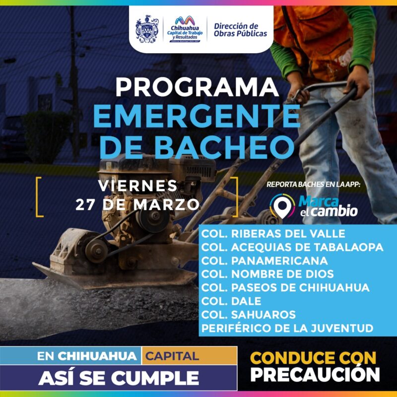 H. Ciudad de Chihuahua, Chih., a 27 de marzo de 2026.- El Gobierno Municipal, a través de la Dirección de Obras Públicas, realizará trabajos de bacheo este viernes 27 de marzo mediante el programa emergente en las calles de las colonias: Riberas del Valle, Acequias de Tabalaopa, Panamericana, Nombre de Dios, Paseos de Chihuahua, Dale y Sahuaros, así como en el periférico de la Juventud.