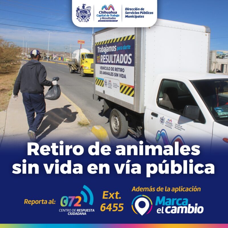 H. Ciudad de Chihuahua, Chih. A 7 de agosto de 2025.- El Gobierno Municipal, a través de la Dirección de Servicios Públicos, trabaja de forma permanente en el retiro de animales sin vida de la vía pública, en atención a reportes ciudadanos.