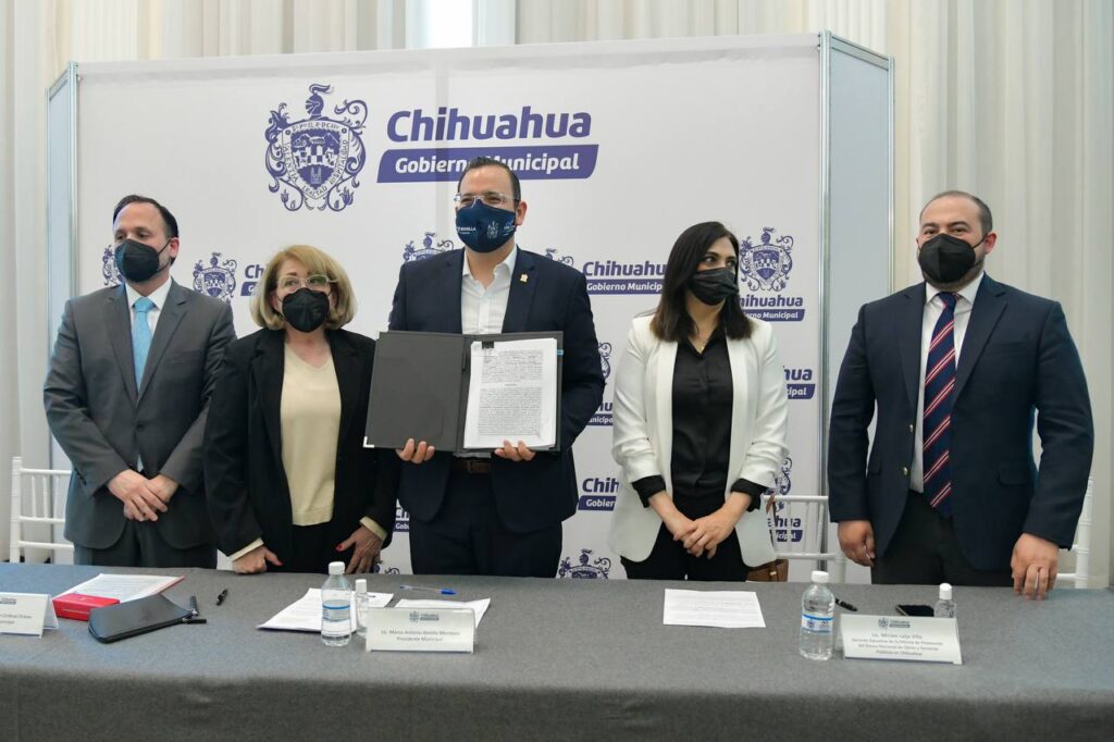 Ante la presencia de los directores e invitados especiales, el Alcalde de Chihuahua, la Tesorera del Municipio, el secretario del Ayuntamiento, el regidor de la Comisión de Hacienda y la Gerente Ejecutiva de la Oficina de Promoción de BANOBRAS en Chihuahua, firmaron el contrato del crédito por 318 millones de pesos, luego del finalizar el análisis para determinar que banco otorgaba el interés más bajo.