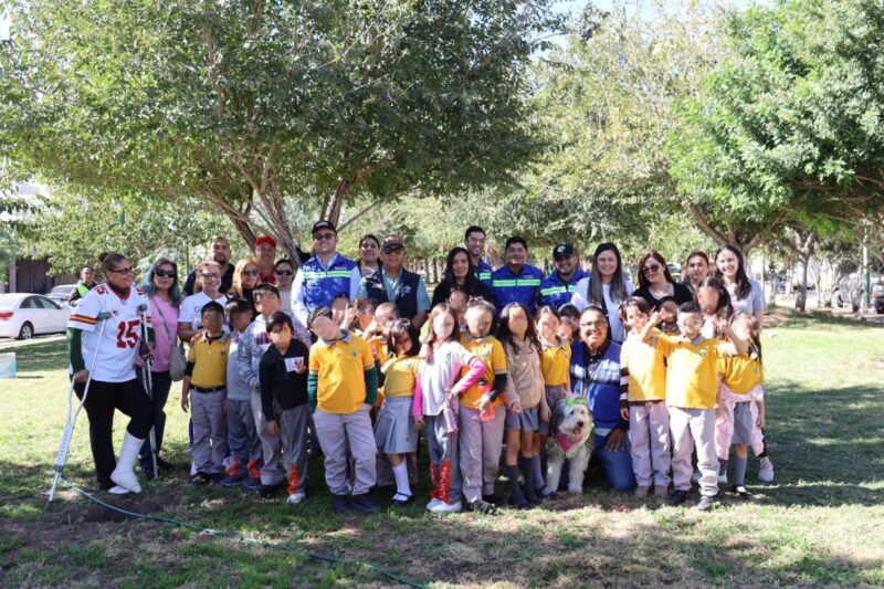 H. Ciudad de Chihuahua, Chih., a 6 de noviembre de 2025.- Las niñas y niños de la escuela Primaria Jesús Reyes Heroles, plantaron junto con personal del Gobierno Municipal y vecinos del sector Alamedas, 20 árboles de especies como encino siempre verde y palo verde en el parque Rafael Muñoz.