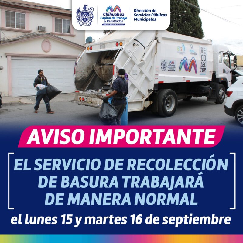H. Ciudad de Chihuahua, Chih. A 12 de septiembre de 2025.- El Gobierno Municipal, a través de la Dirección de Servicios Públicos, informa a la población en general que el servicio de recolección de residuos habitacionales trabajará de forma regular este 15 y 16 de septiembre.